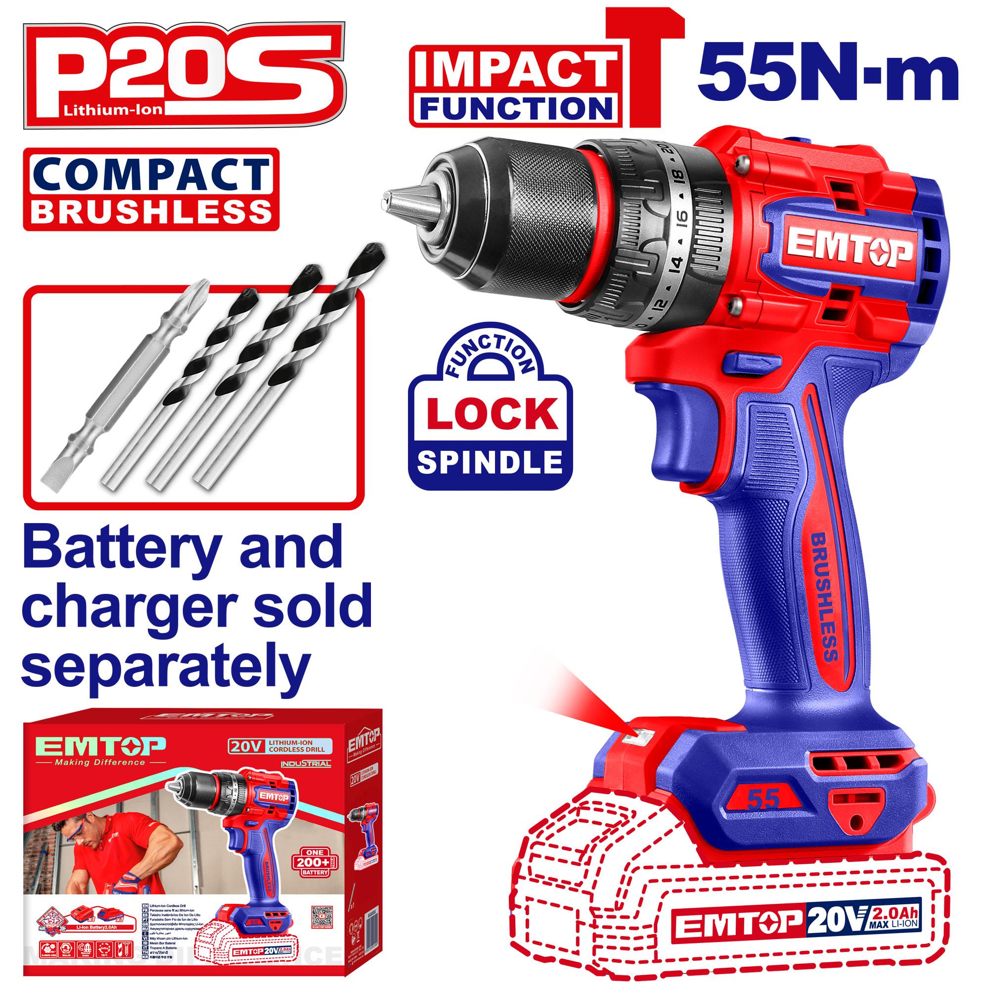 The EMTOP 20V Compact Brushless Cordless Impact Drill combines power, precision, and efficiency in a portable design. With a brushless motor, 55Nm torque, and 2-speed gearbox (0–500 / 0–2000 RPM), it’s ideal for drilling and fastening across multiple materials. The 13mm metal chuck, spindle lock, and 22+1 torque settings ensure strength and accuracy, while the LED light improves visibility. Complete with 2 Cr-V bits and packed in a color box — a perfect blend of performance and convenience. Battery and charger sold separately