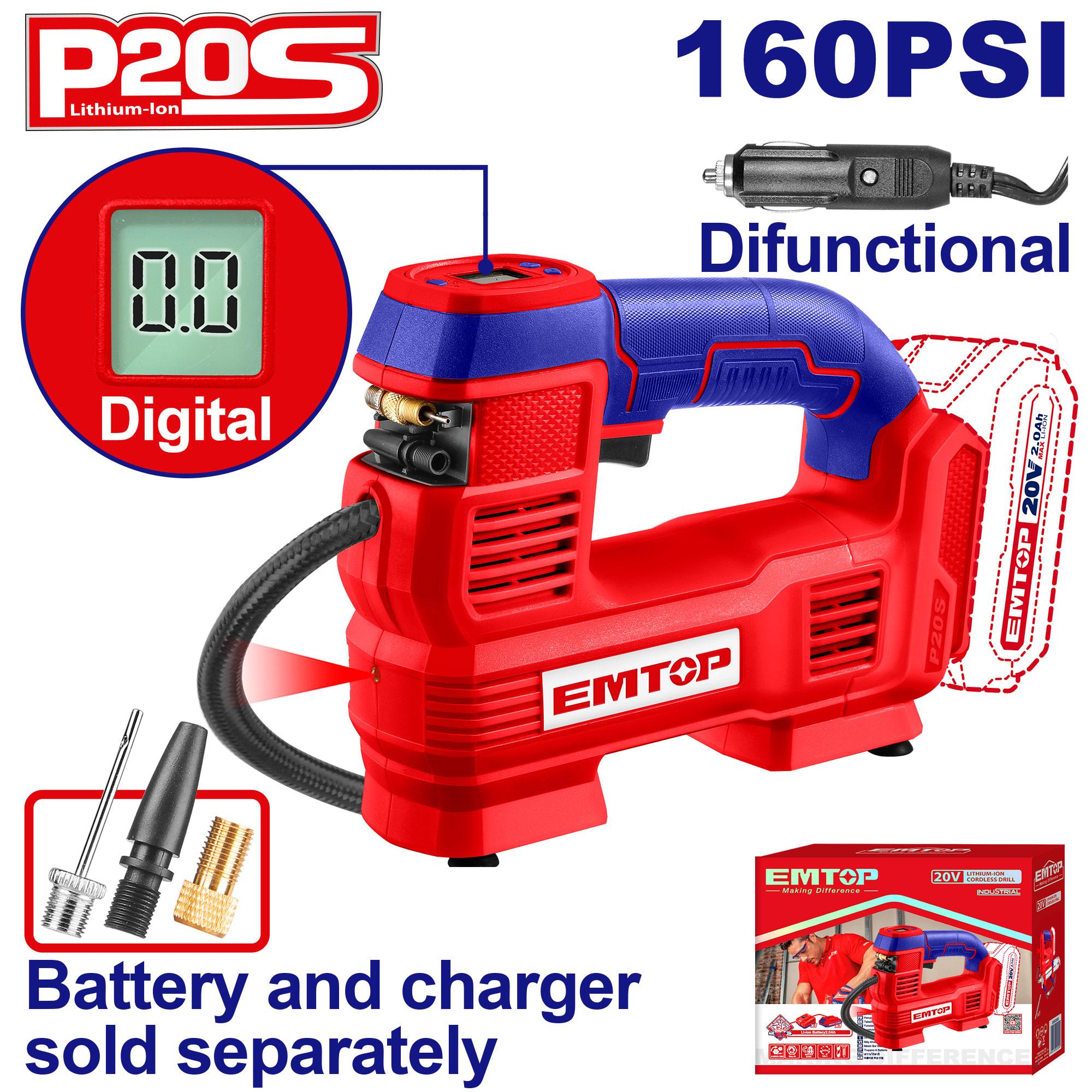 The EMTOP 20V Cordless Auto Air Compressor delivers up to 160 PSI (11 BAR) with a fast 35L/min air flow, making it perfect for inflating car tires, bike wheels, and sports gear. Its integrated LED light ensures visibility during nighttime use, while the included adaptors, air tube, and 3m cord provide flexibility for various tasks. Compact, cordless, and easy to use, this compressor offers reliable performance on the go. Battery and charger sold separately; packed in a sturdy color box.